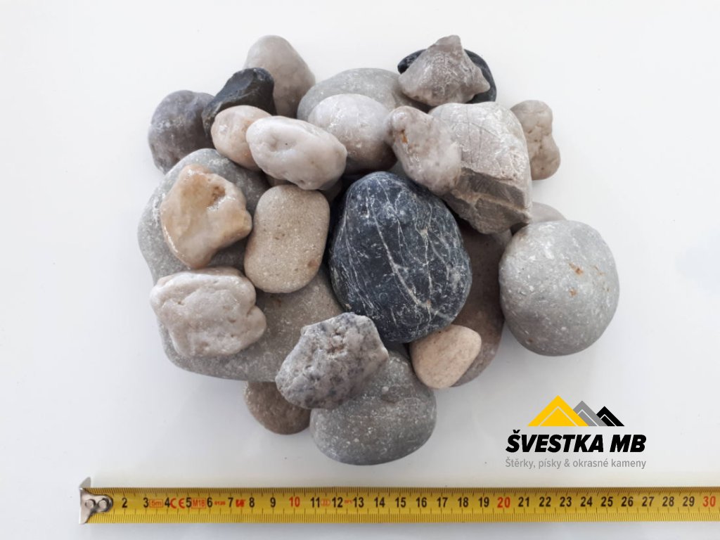 Kačírek praný šedobílé barvy o velikosti 22-70 mm. Vhodný do záhonů.