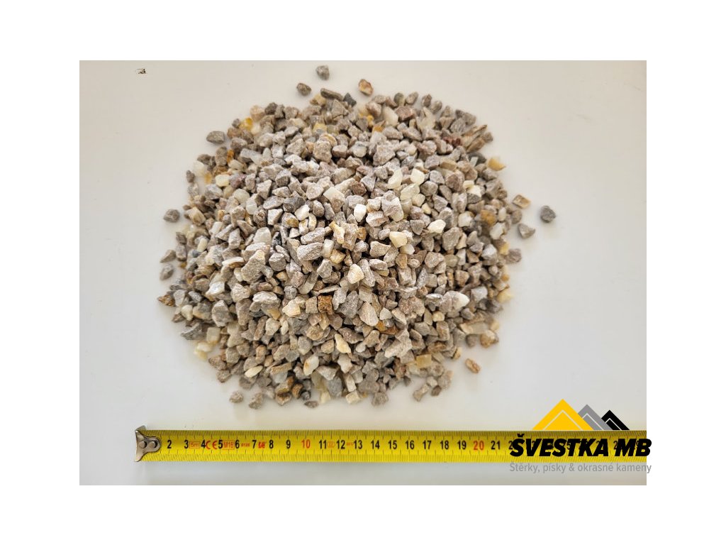 Štěrk (drť) bílošedé/bílobéžové barvy o velikosti 4-8mm. Vhodný do trvalkových výsadeb jako mulč, na cestičky, do zatravňovací dlažby.